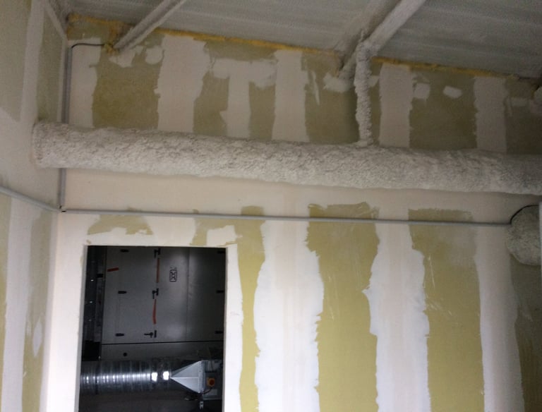 Sécurisation des structures métalliques, planchers, dalles et gaines techniques par projection de laine de roche, de produits pâteux ou peintures intumescents